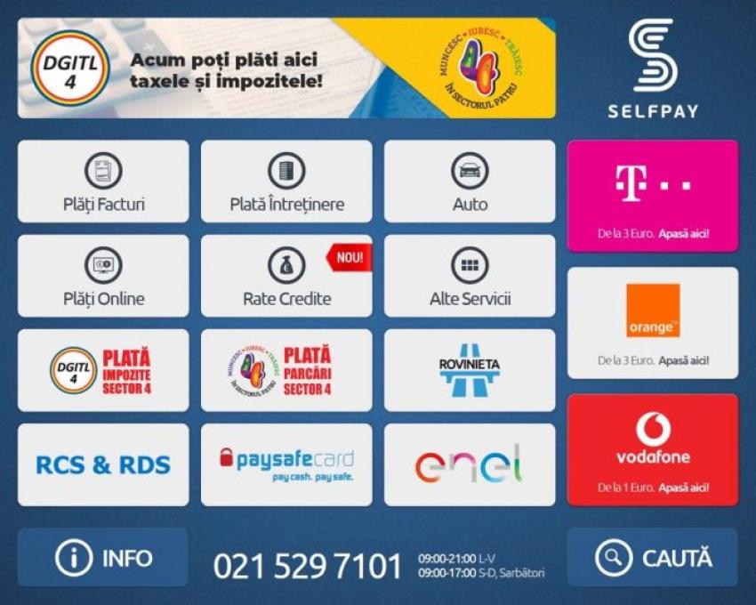 Pentru al șaselea an consecutiv, toate plățile datorate bugetului local al Sectorului 4 se efectuează exclusiv online, prin ordin de plată sau la aparatele SelfPay, evitându-se, așadar, aglomerația și timpii pierduți la cozi în fața ghișeelor.